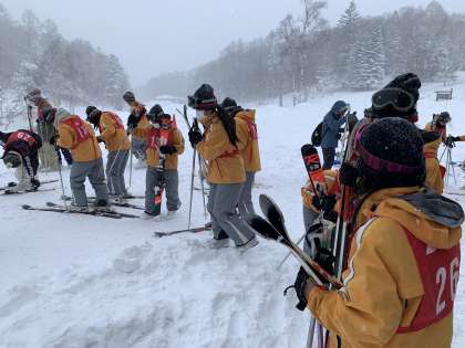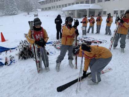 着替えも終わり、スキー板、ストック渡され、いよいよ開校式です。