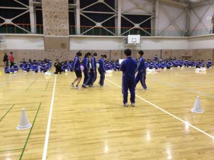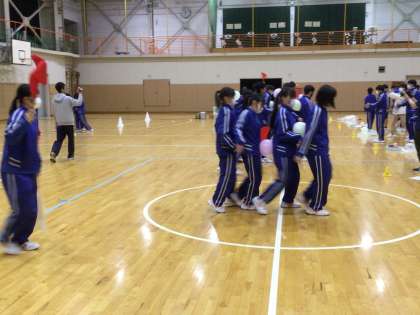 4人1組で縦に並び、間に風船をはさんで進みます。