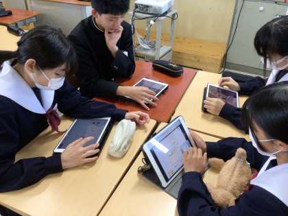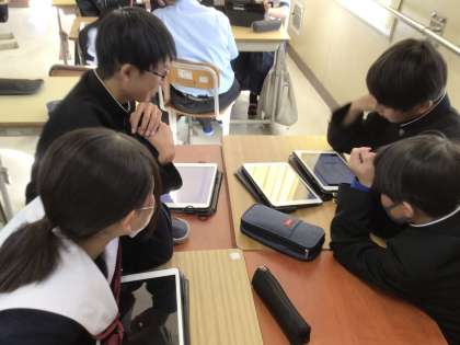 ここまで行ってきた探究学習。今日は、クラスを解体して、同じことに興味のある生徒同士が集まっての活動です。同じ気持ちを持った仲間同士ですので、話し合いも盛り上がっています。