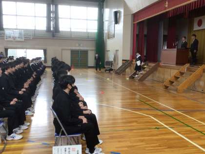 留意すべきことを話されると、3年生の多くの生徒がうなずきながら聞き、しっかりと確認していました。