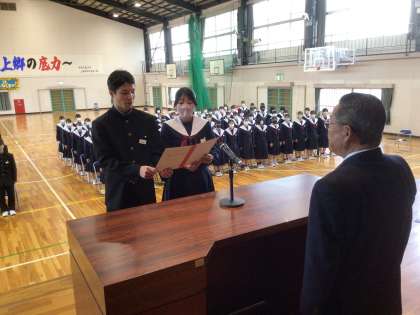 代表生徒による誓いの言葉と共に上郷中学校同窓会に入会です。