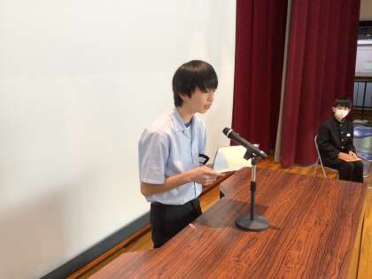 最初は馴染めなかったクラスでしたが体育祭、合唱コンクールを通して、学級が一つになることを感じました。楽しむことは一生懸命になることの意味を実感して大きな成長につながったことを発表しました。
