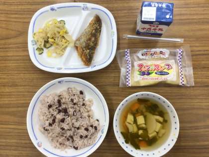 赤飯、すまし汁、さわらのから揚げ、れんこんサラダ、ブルーベリークレープ、牛乳です。