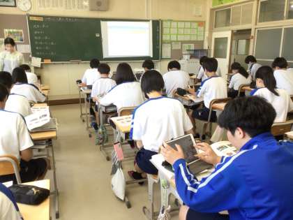 幼児にとって遊びはどんな意味があるのかを資料やインターネットで調べ、学習用タブレットにまとめていました。