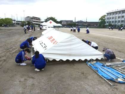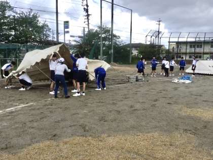 生徒席に設置するテントの設営に保護者の方も手伝いに駆けつけ、生徒と一緒にテントを組み立ててくださいました。