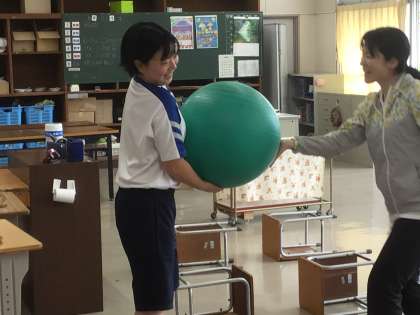 バランスボールを条件をつけて運びながら障害物を越えていきます。