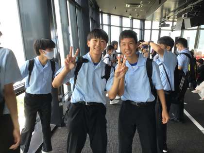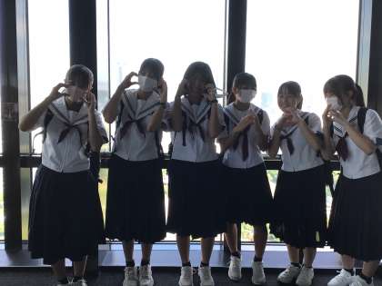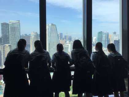 6組東京タワーに登ります。東京タワーよりスカイツリーを望みます。