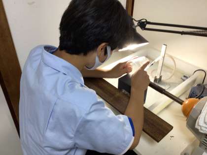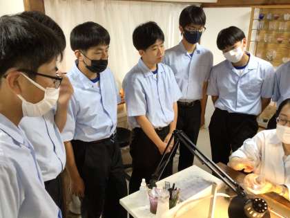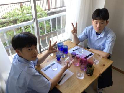 6組江戸切子体験です。滅多にできない体験です。はじめに説明を聞き、グラスを選び、削ります。みんななかなかスジが良さそうですよ。