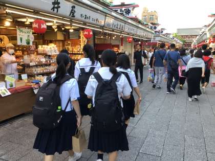 6組は、切子作りが早く終わり、浅草寺仲見世を散策中です。平日夕刻でもなかなかの人の出です。