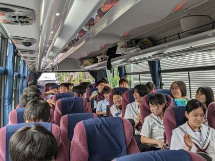 2組のバス内では、延々とインタビューコーナーが続いています。