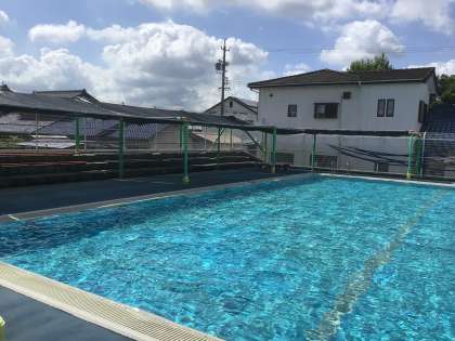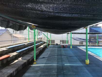 プールサイドには、見学者用や集合場所として日よけを設置しています。