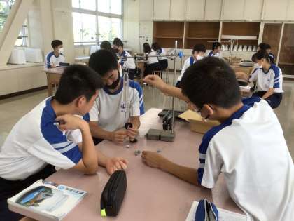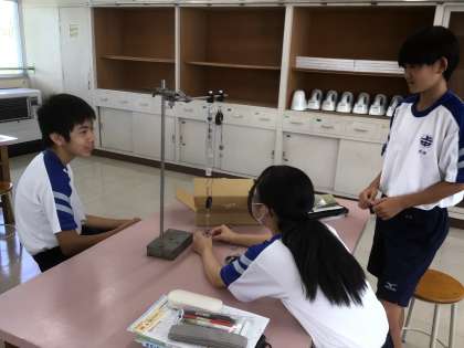 滑車を使った実験をしていました。