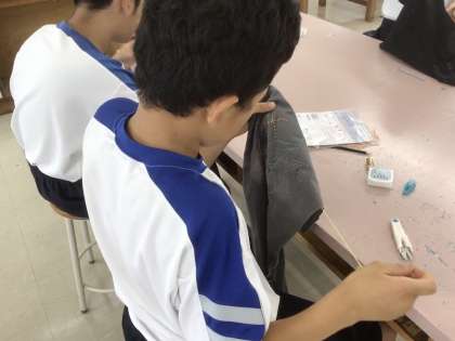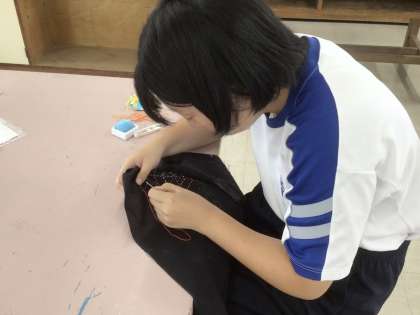 印に合わせて、いろいろな色の糸を縫い付けます。