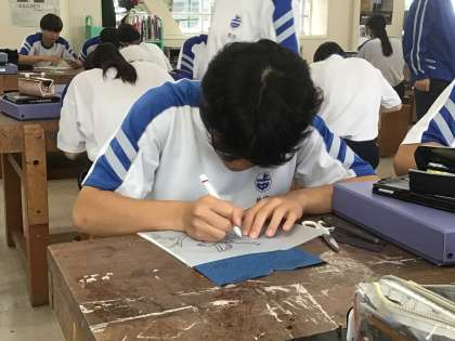 デザインを写し取り、カッターナイフで切り取り始めている生徒がいました。