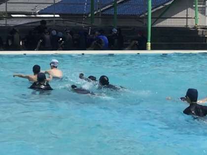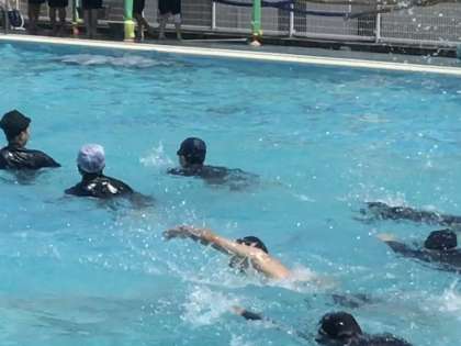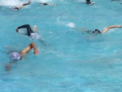 5分間でどのくらいの距離を泳げるかに挑戦していました。