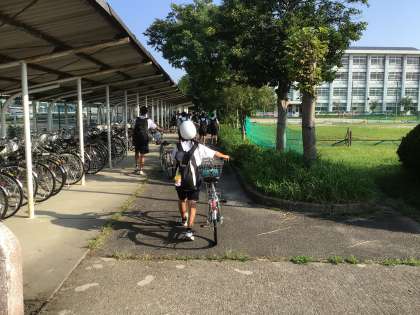 登校する生徒の額には汗が見えます。