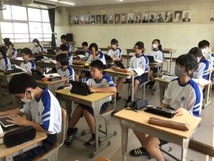 合唱コンクールで歌う曲を学習用タブレットで聴いているところでした。