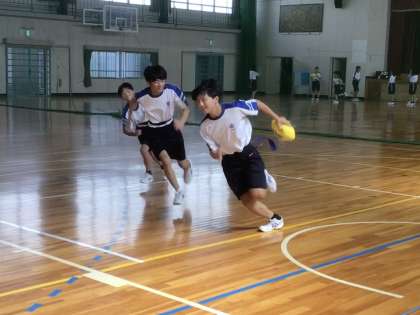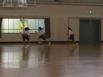 運動場での活動を見合わせ、体育館でタグラグビーを行いました。