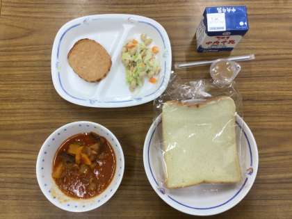 スライスパン、ラタトウイユ、とよたひまわりポーク入りハム、ビーンズサラダ、牛乳、ももゼリーでした。