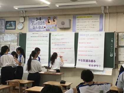 黒板に歌詞が書かれた掲示物を貼り、歌い方などを書き込んでいるクラスがありました。