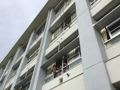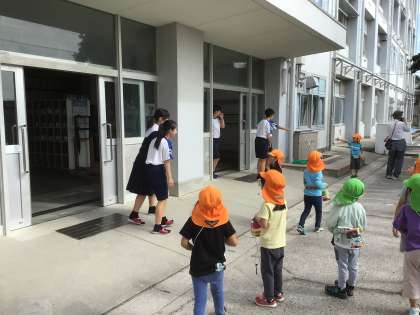 放課になり、園児のみなさんに気づいた生徒が窓から手を振っていました。