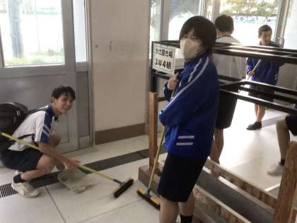 下校時に、3年生の生徒が昇降口の砂を掃いてくれていました。