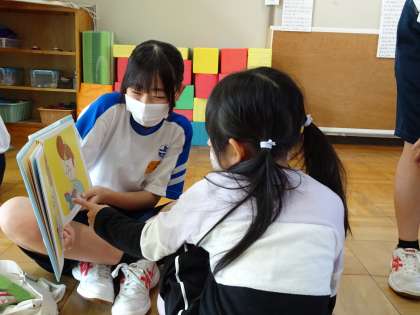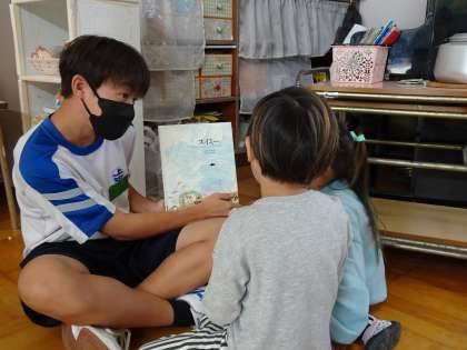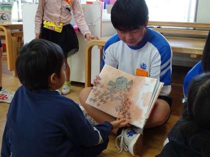 選んだ本に興味をもってくれ、中学性も園児も楽しそうですね。