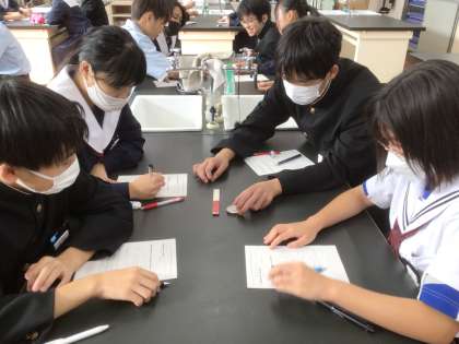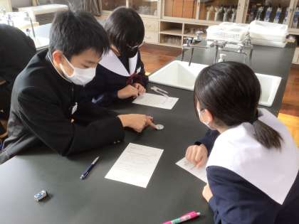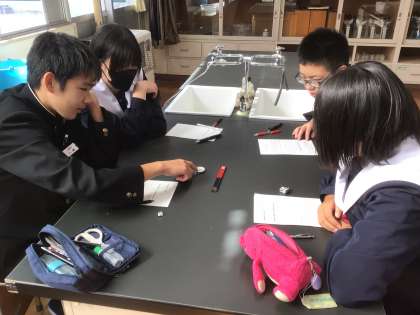 棒磁石の周りに方位磁針を置くとどうなるか、予想してから確かめました。
