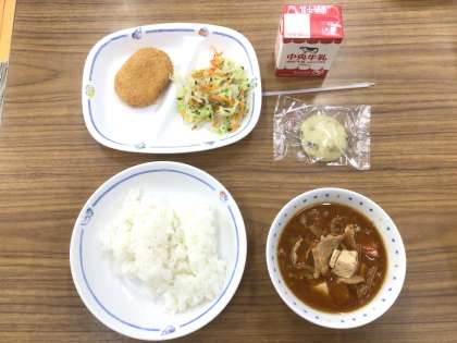ごはん、豊田市産じゃがいもコロッケ、青菜あえ、とよたひまわりポークの赤だし、おにまんじゅう、牛乳でした。