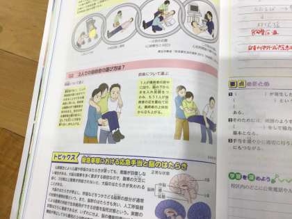 保健で、2人で疾病者を運ぶ方法を実際に体験しました。