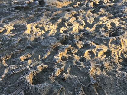 運動場の砂場を見ると、霜が。
