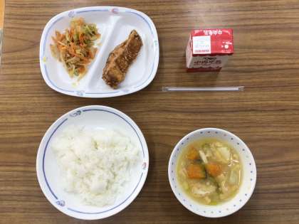 ごはん、かぼちゃのみそ汁、ぶりのから揚げ、はくさいのごまあえ、牛乳です。
