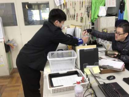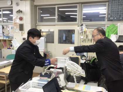 今朝は、先生たちにも協力依頼があり、生徒が職員室に来ました。