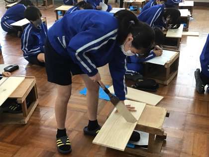 小学校でノコギリを使ったことがあるとはいうものの、まっすぐ切るのに苦労していたようです。