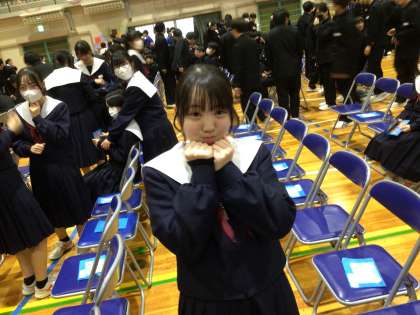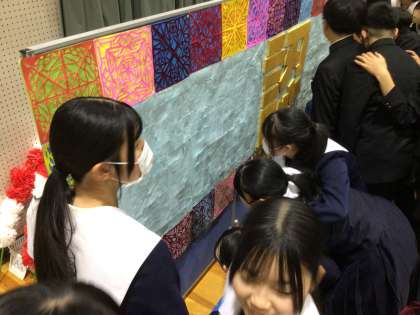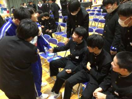休憩時間になりました。1、2年生からのメッセージを3年生が読んでいます。