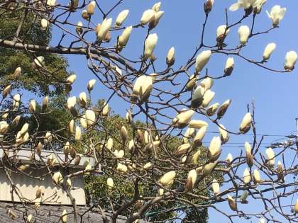 校地内のハクモクレンの花が、今まさに咲き乱れようとしています。