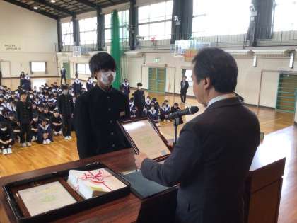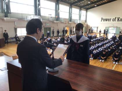 修了式が始まりました。最初に上中賞の表彰です。