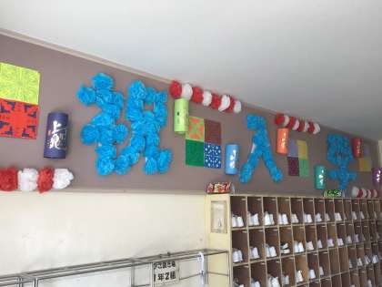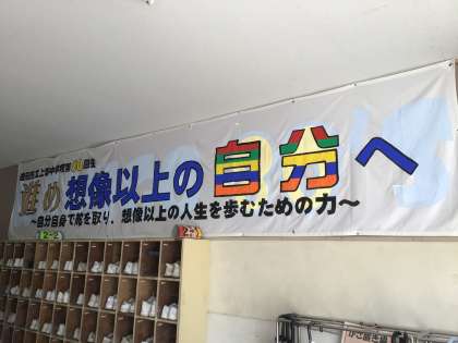 3年生は個人の志、2年生は学年スローガン、1年生は入学のお祝いが掲示されています。