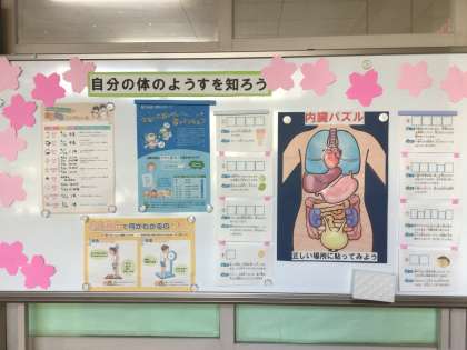 保健室前の掲示板に、「自分の体のようすを知ろう」という掲示があります。