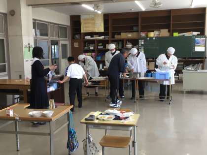 給食の準備です。 1年生も含め、みんなで手際よく準備をしていました。