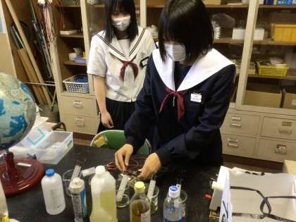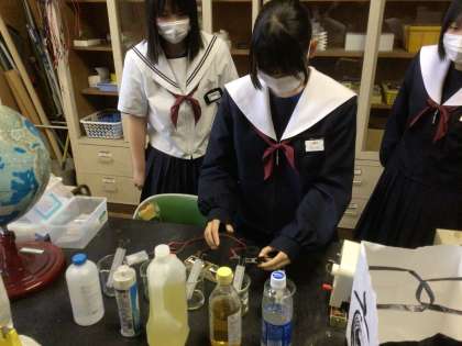 酢やサラダ油など、いくつかの液体が電流を通すか通さないかを、実験して確かめていました。