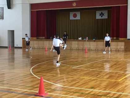 フリスビーのようなものを使ってカラーコーンでつくったゴールに蹴り込みます。