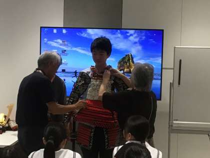 代表生徒が甲冑を身につけさせてもらいました。