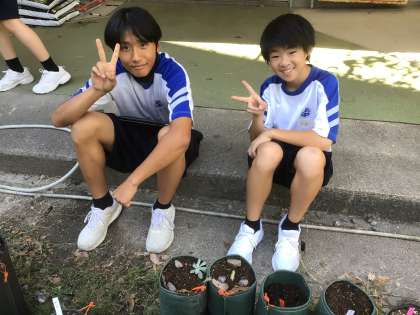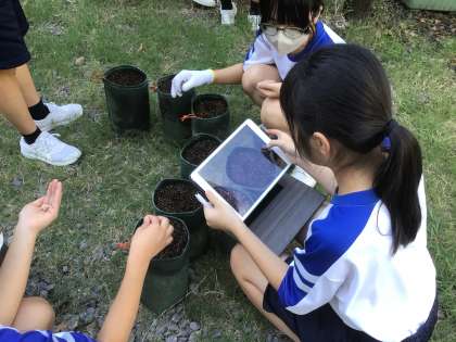 学習用タブレットで記録します。 芽はいつ出てくるかな。