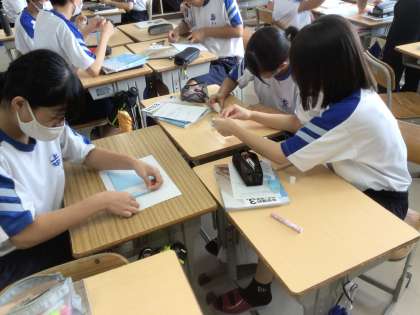 実験で使った記録テープを台紙に貼り、改めて実験結果を考察しました。
