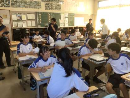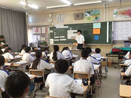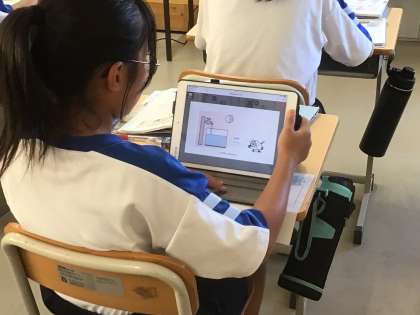 途中、学習用タブレットで小学校の既習内容を振り返り、関数と結びつけていきました。
