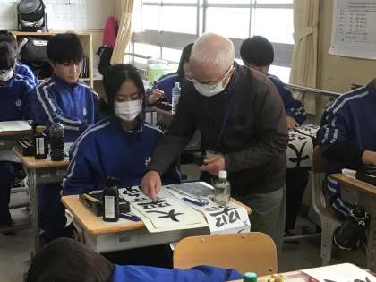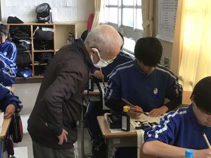 書道ボランティアさんのアドバイスをいただきながら練習に励んでいました。