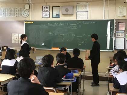 黒板の例文を頼りに、相手よりも早く答えられるようにがんばりました。