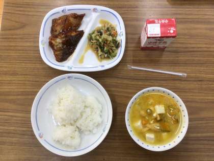 ごはん、かぼちゃのみそ汁、ぶりのゆずあんかけ、ごまあえ、牛乳です。