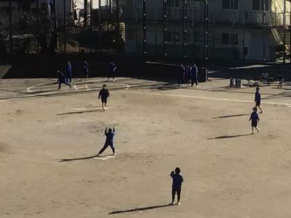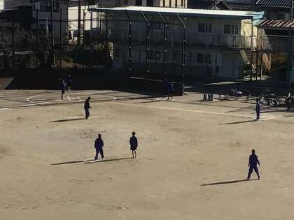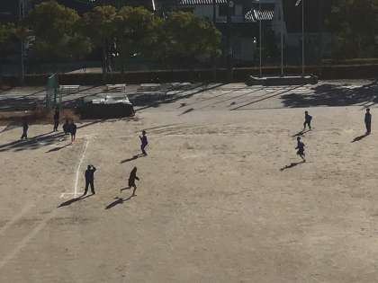 グラウンドでは、1年生が体育の授業でソフトボールのゲームをしていました。
